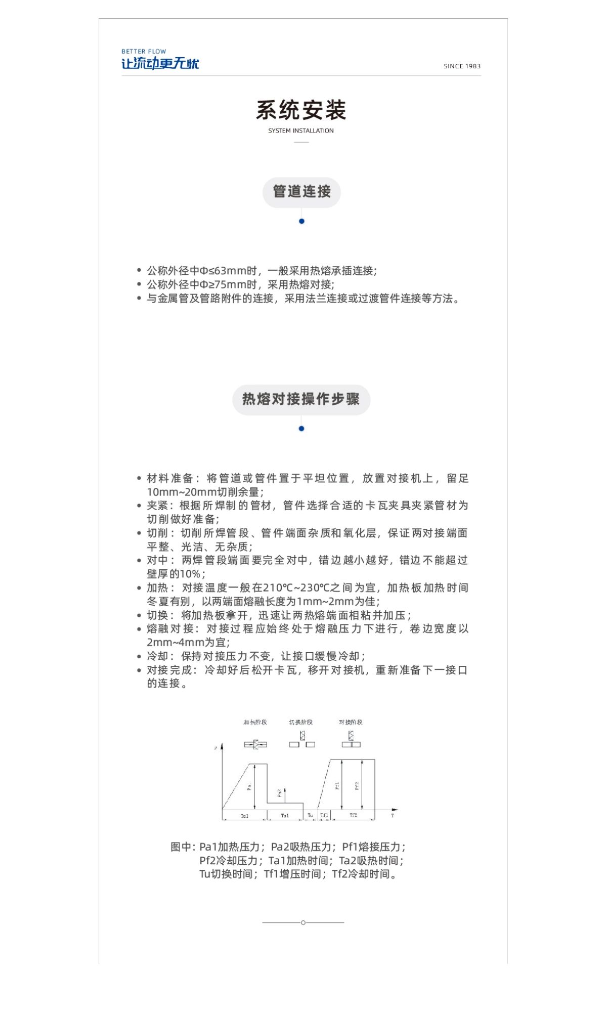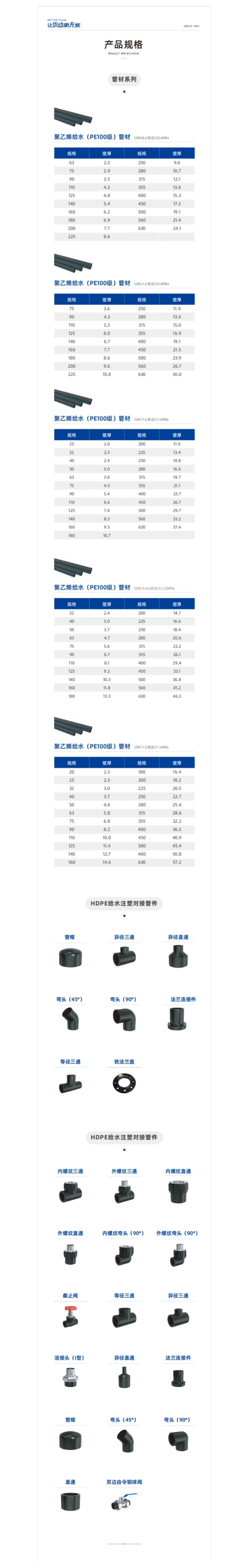 以PE80級、PE100級專用料為原料,按照GB/T13663進(jìn)行設(shè)計(jì)和生產(chǎn),給水用PE管道的規(guī)格應(yīng)根據(jù)其設(shè)計(jì)的連續(xù)工作溫度、工作壓力、使用壽命而選用。一般情況下,PE管道適用于輸送介質(zhì)溫度不高于40℃,工作壓力不大于1.0MPa。