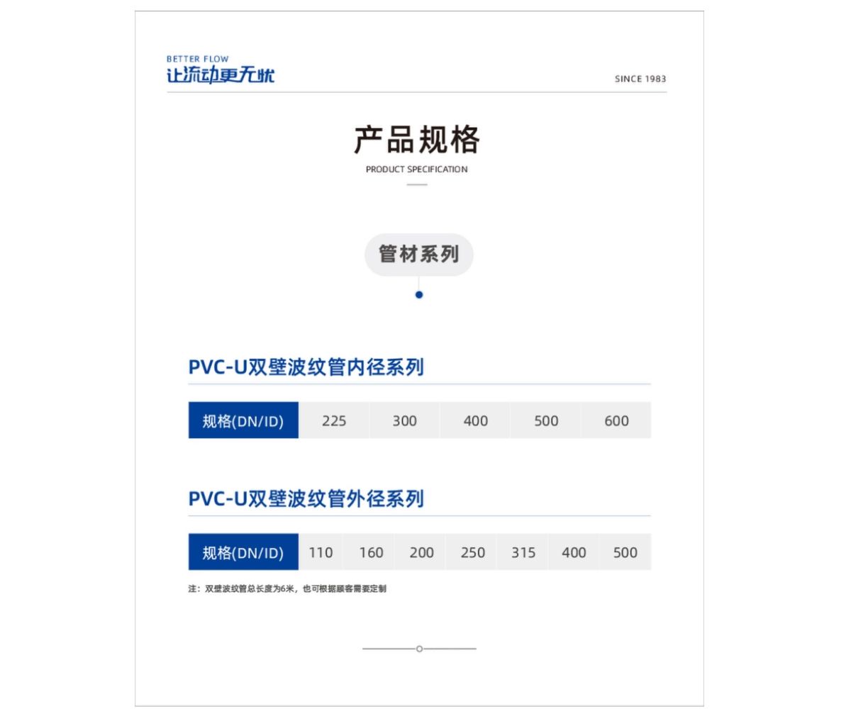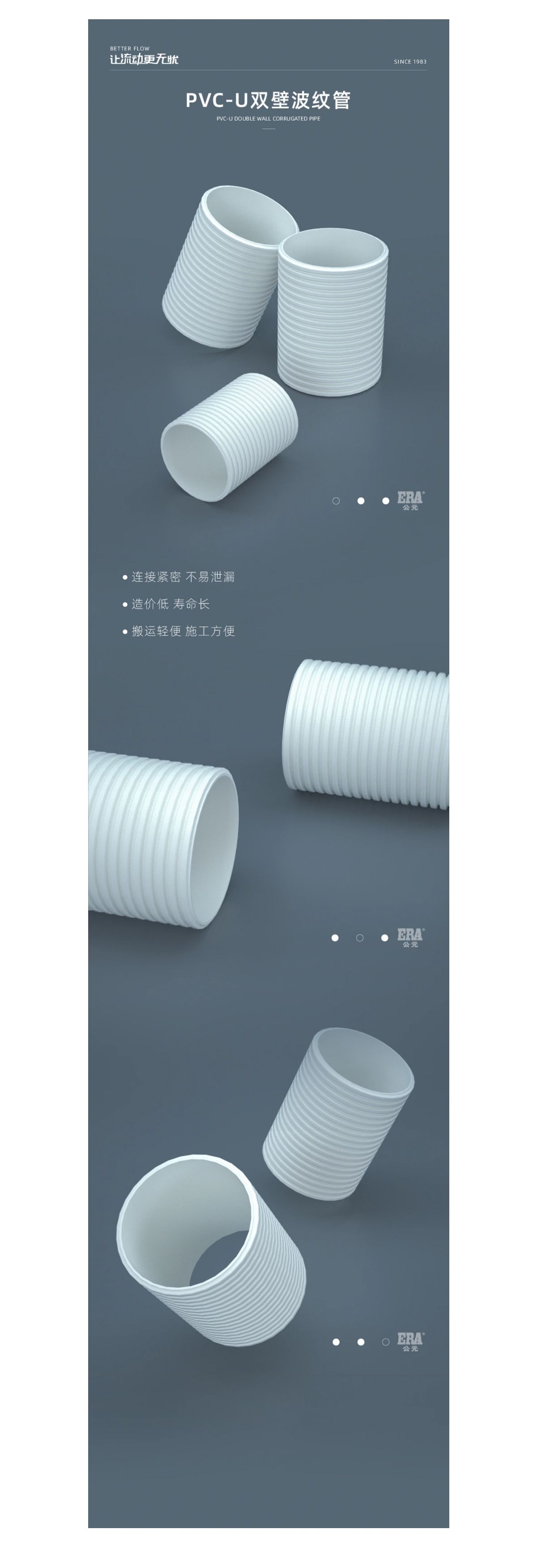 “公元” “永高”牌PVC-U雙壁波紋管是由硬質(zhì)聚氯乙烯為主要原料生產(chǎn),內(nèi)壁光滑、外壁波紋、內(nèi)外壁之間中空的特殊管道。主要用于埋地排污、排水系統(tǒng),產(chǎn)品尺寸110~630mm。產(chǎn)品執(zhí)行標(biāo)準(zhǔn)GB/T 18477.1《埋地排水用聚氯乙烯(PVC-U)結(jié)構(gòu)壁管道系統(tǒng) 第1部分:雙壁波紋管材》結(jié)構(gòu)特殊、接口利用橡膠密封圈柔性連接,具有連接牢靠、不易泄漏、搬運輕便、施工方便等特點,綜合造價比鑄鐵管、水泥管低,使用壽命長達(dá)50年以上。雙壁波紋管是世界各國塑料埋地排水、排污應(yīng)用最多的管道。