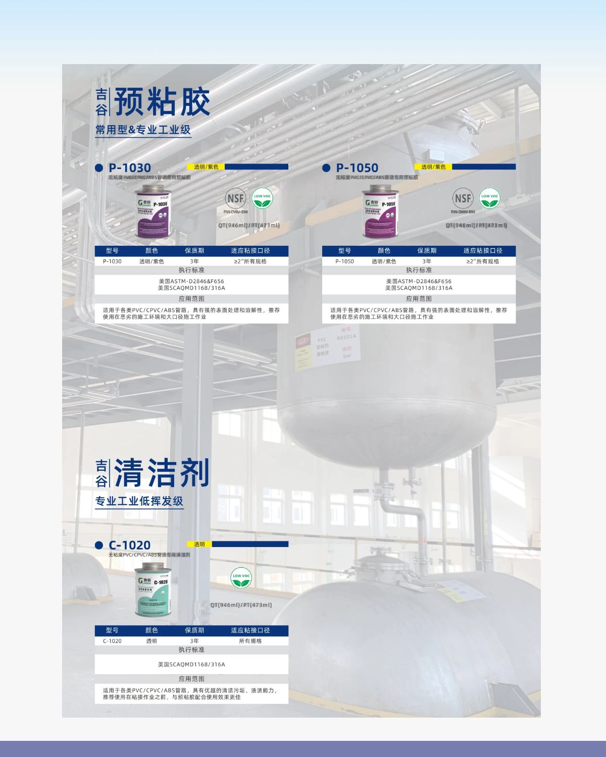 預(yù)粘膠有良好的清潔軟化粘接表面,使得膠水更容易滲透粘接表面,達(dá)到粘接最大強(qiáng)度。低揮發(fā)低揮發(fā)LovVOC環(huán)保級(jí)。應(yīng)用在民用或工業(yè)PVC/CPVC/ABS管道粘接口清潔軟化,施工環(huán)境和天氣苛刻條件時(shí),特別是大口徑裝配,可降低粘接難度。